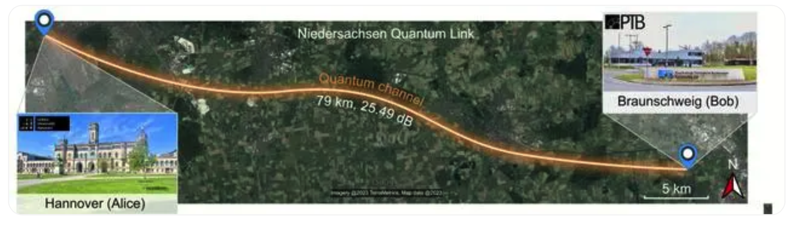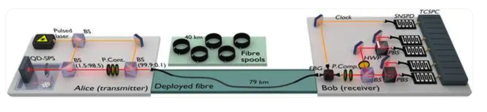 結(jié)合提前搭建的量子密鑰加密發(fā)送端,將單光子密鑰經(jīng)過長達(dá) 79 公里的光纖,發(fā)送到 Stefan Kück 課題組的實(shí)驗(yàn)室接收端進(jìn)行解密。