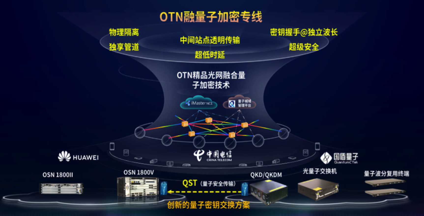 2022年5月,中國電信集團(tuán)科技創(chuàng)新部發(fā)起研發(fā)戰(zhàn)略合作,由中國電信研究院和安徽電信牽頭,華為、國盾量子、中電信量子多方合力,歷時3個月完成樣機(jī)的研發(fā)、調(diào)試以及實(shí)驗室驗證,并于2022年12月在安徽電信現(xiàn)網(wǎng)完成試點(diǎn),通過量子加密的OTN專線承載合肥市信息中心到合肥市大數(shù)據(jù)運(yùn)營有限公司之間的業(yè)務(wù)。該方案依托廣覆蓋、高可靠的OTN精品光網(wǎng),通過創(chuàng)新的安全接口實(shí)現(xiàn)華為OTN設(shè)備與國盾QKD(Quantum Key Distribution,量子密鑰分發(fā))設(shè)備間密鑰的安全獲取,基于量子密鑰完成了OTN專線的L1層業(yè)務(wù)加密。實(shí)測證明,OTN融量子加密專線引入的額外時延低至百納秒,相對業(yè)務(wù)傳輸?shù)暮撩爰墪r延可忽略不計,且?guī)捫柿銚p耗。在OTN天然硬管道隔離的基礎(chǔ)上,通過量子安全傳輸實(shí)現(xiàn)密鑰分發(fā)具備抗量子攻擊的優(yōu)勢,使OTN專線能夠為各行業(yè)客戶提供高等級安全保密連接服務(wù)。